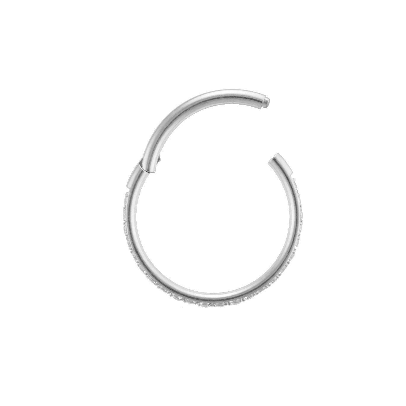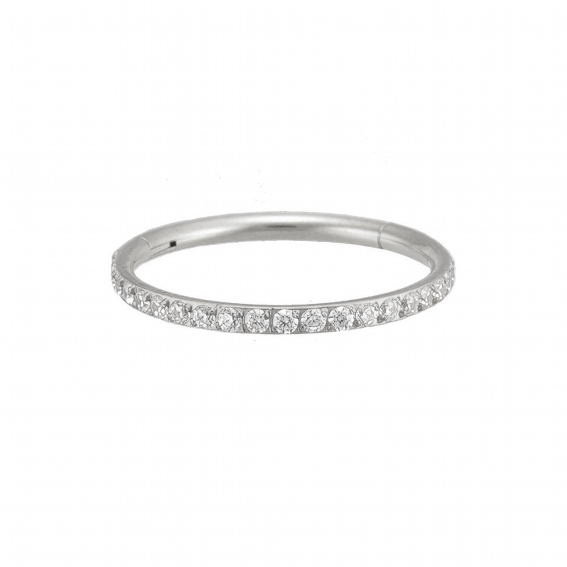 Piercing Clicker oder Scharnierring aus Edelstahl mit weissen Strasssteinen auf der Vorderseite.