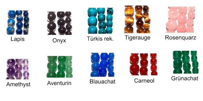Wir haben folgende Halbedelstein Kugeln zur Auswahl: Lapis, Onyx, Türkis rek, Tigerauge, Rosenquarz, Amethyst, Aventurin, Blauachat, Carneol und Grünachat.