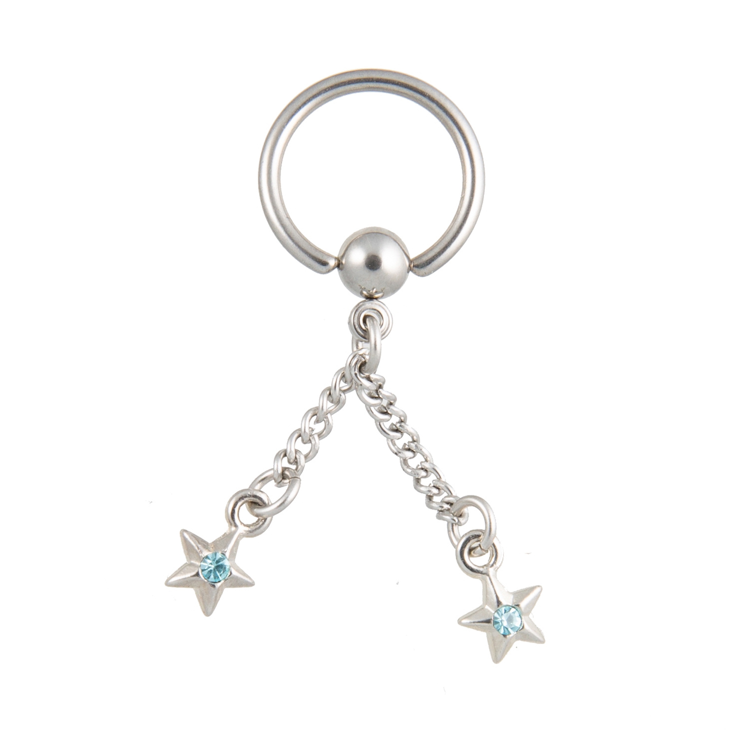 Dieser Ring aus Edelstahl mit zwei Strasssternketten ist sehr beliebt und wird überwiegend an Ohr, Brust und Nabel getragen.